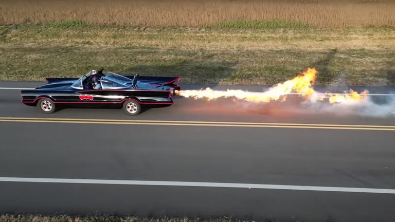 Se construye su propio Batmóvil y lo lleva al límite: ametralladoras a los lados, propulsores y bombas de humo